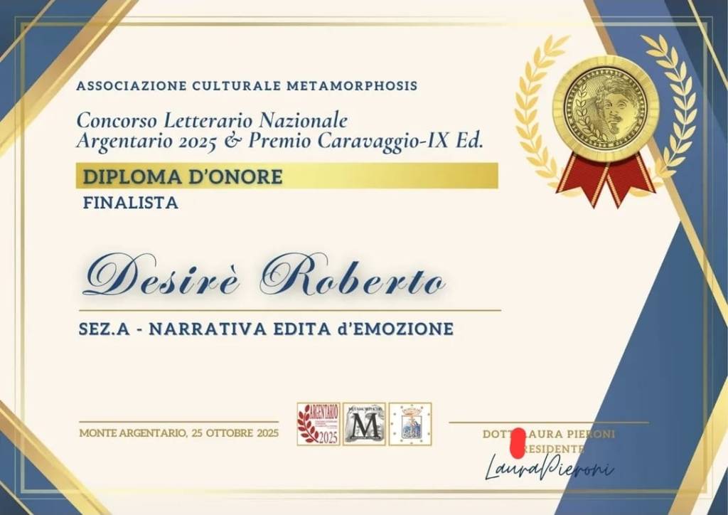 Diploma D’Onore. Concorso Letterario Nazionale Argentario 2025& Premio Caravaggio IX edizione. Monte Argentario (GR)